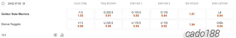 Tỷ lệ kèo chấp Golden State Warriors vs Denver Nuggets